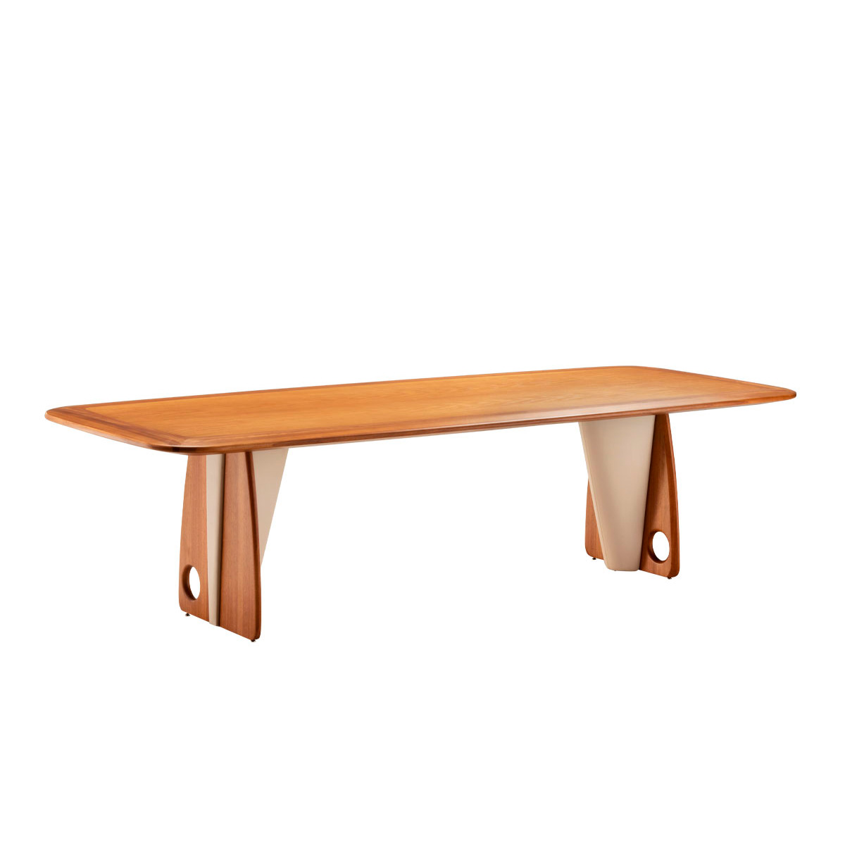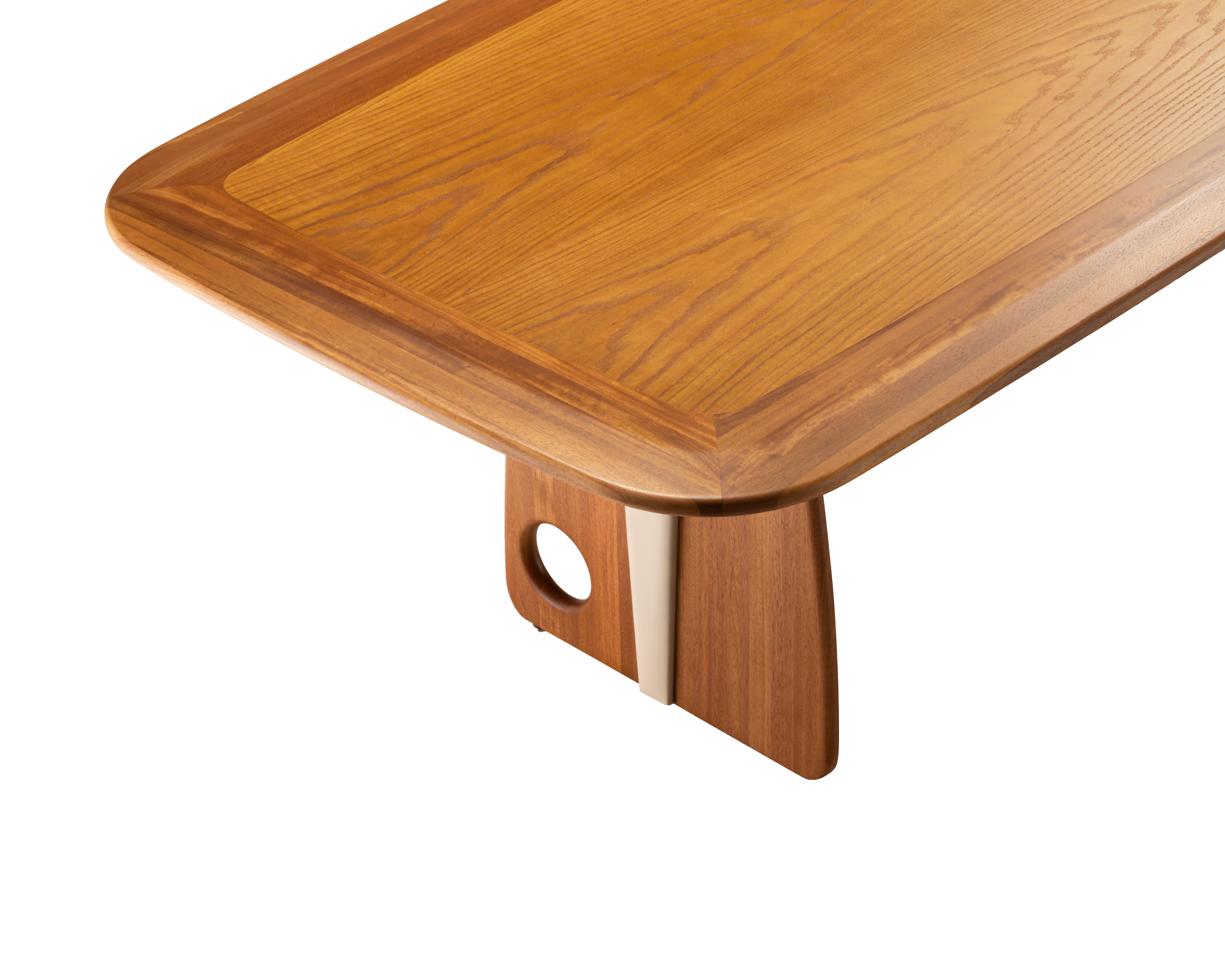 Compósito piece highlights the combination of two excellent Brazilian materials in its base: jequitibá wood and leather, resulting in a piece that conveys affection, tradition, and warmth. The design explores curves and overlays with precision, revealing an appreciation for refined details. The seamless, infinity edge of the tabletop further enhances the wood and complements the natural oak veneer panels, allowing for varied compositions and integration with other products.