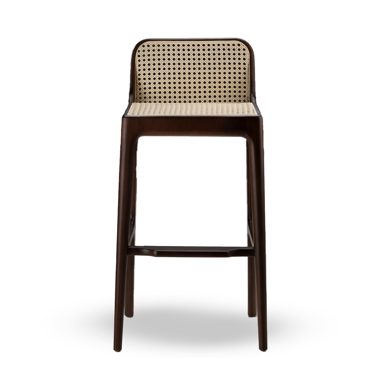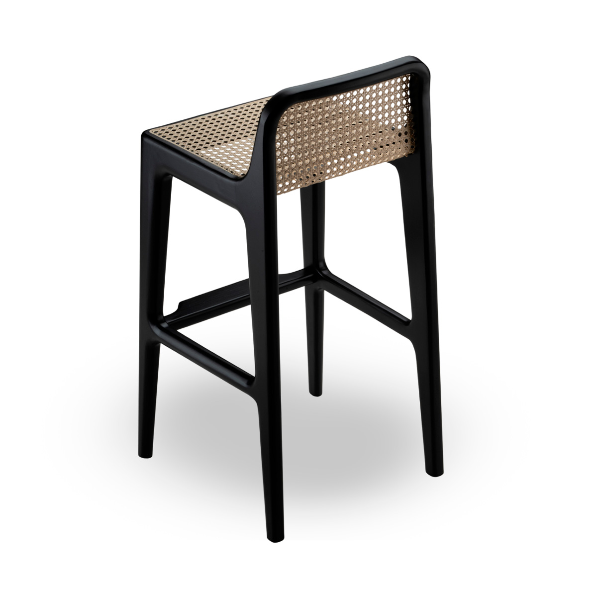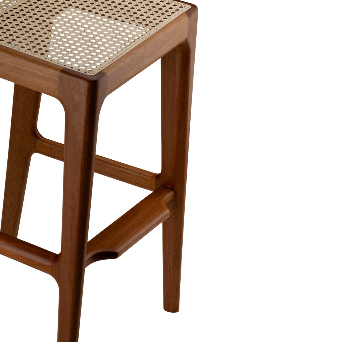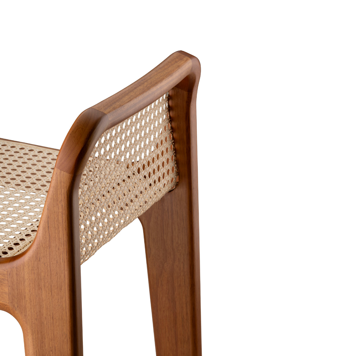 The Selena stool emerges from the international success of the namesake chair, preserving the same organic minimalism that turned the original model into an award-winning icon. In its taller version, it maintains balanced proportions, stability, and visual lightness. Its structure, CNC-machined and finished by hand, reveals continuous curves and smooth surfaces that ensure both comfort and firmness. The natural canework reinforces the line’s identity, bringing transparency and delicacy in an elegant contrast with the solid wood. Versatile for gourmet kitchens, bars, and sophisticated environments, the stool occupies the space with a discreet and refined presence—a mature and contemporary evolution of a well-established classic.